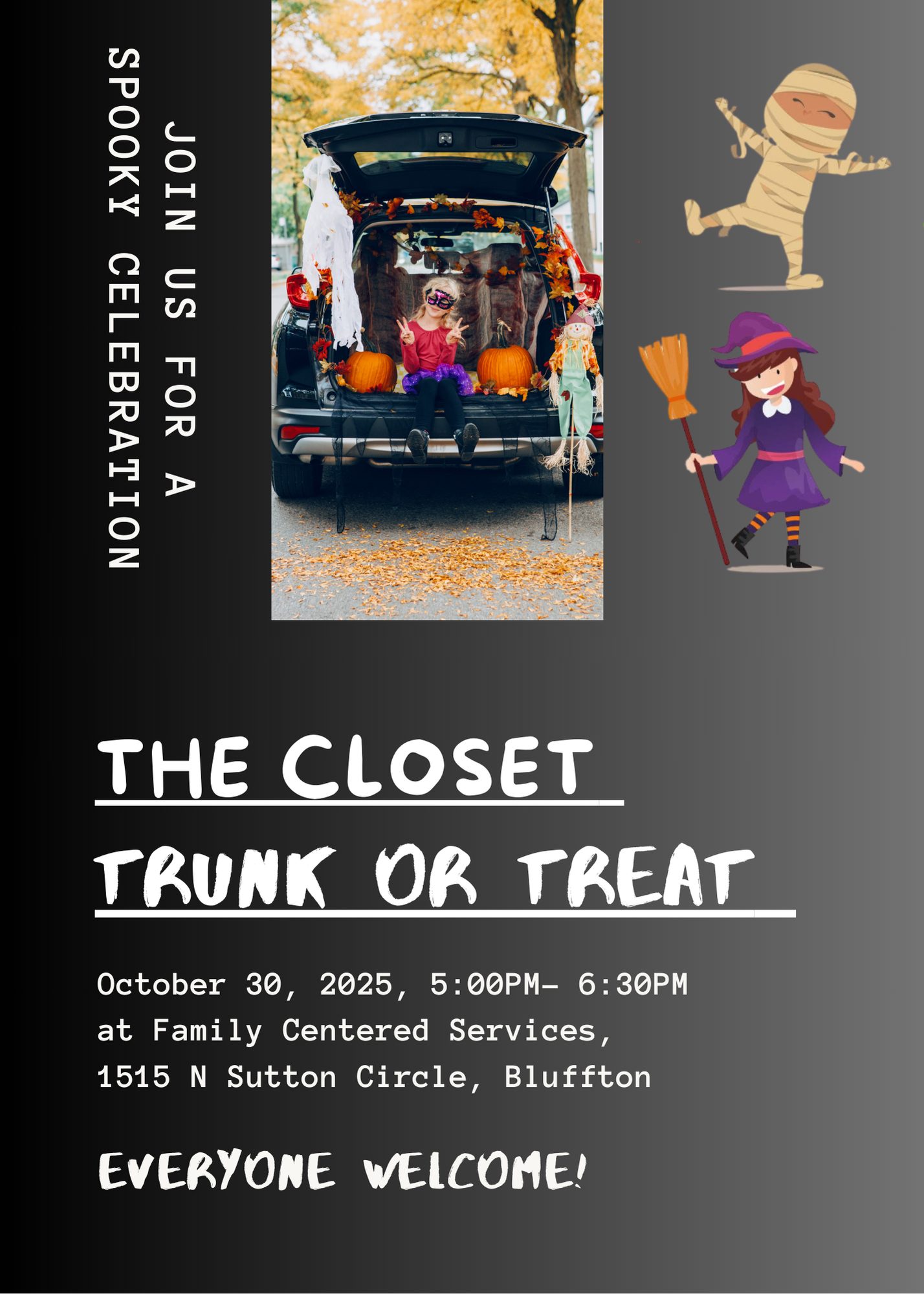 The Closet is hosting a Trunk or Treat event on Thursday, October 30, from 5-6:30pm. All are welcome to come enjoy snacks, drinks, and other goodies that will be handed out by FCS employees and volunteers. We are excited to see you all there!
